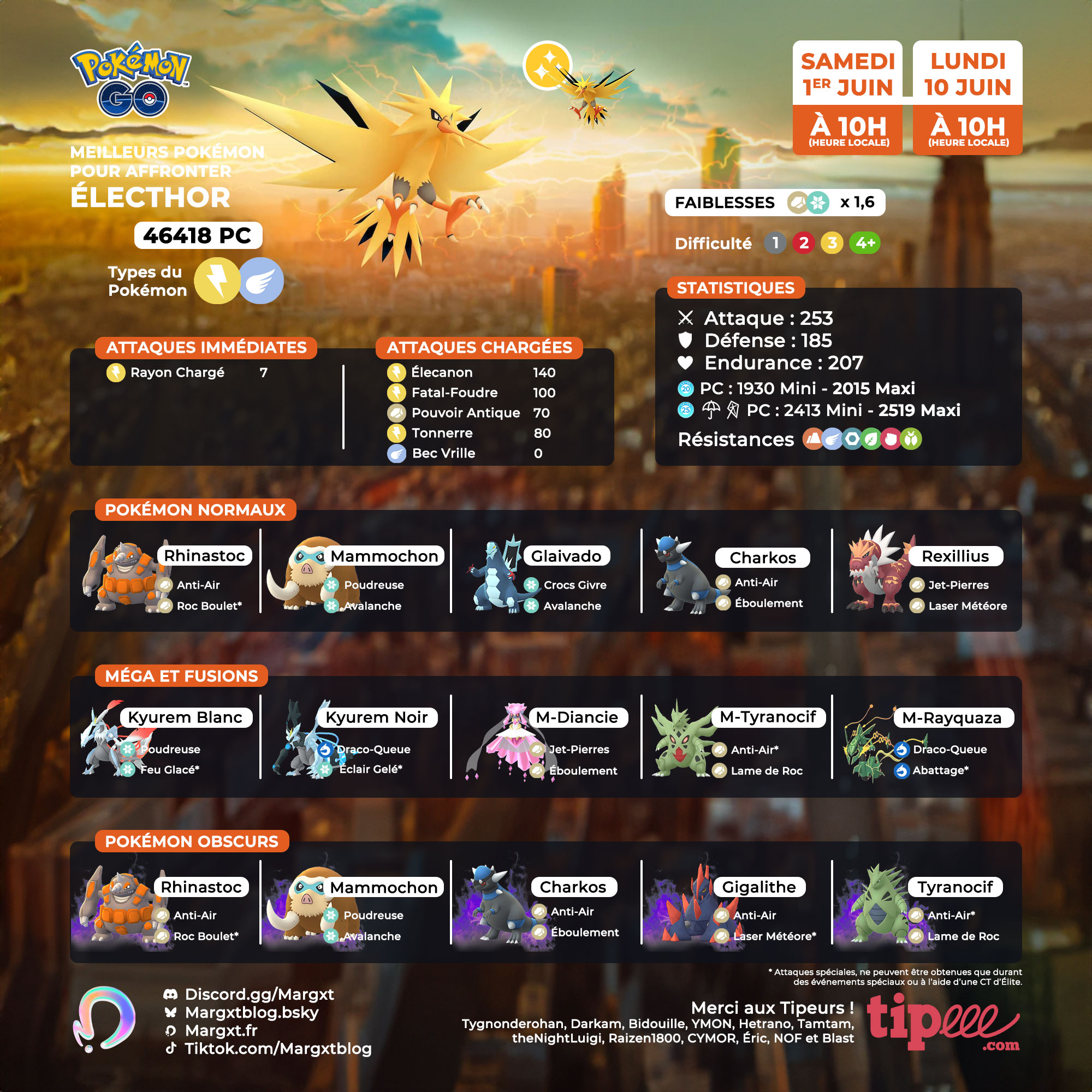 Rencontrez Électhor dans les raids légendaires dans Pokémon GO. Il est accompagné de sa forme shiny/chromatique.