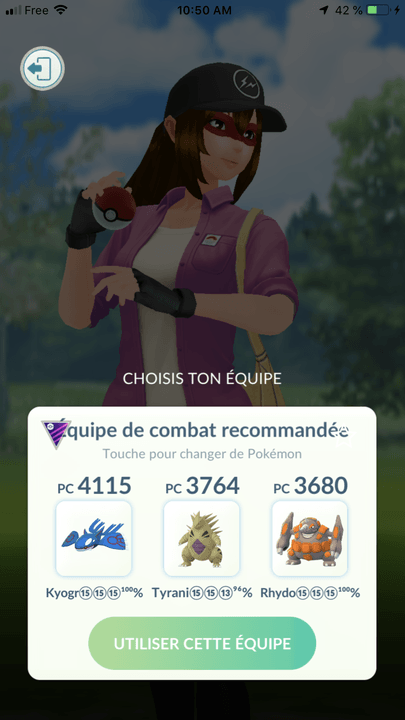 Équipe à adapter selon les Pokémon. Le mieux étant d’avoir un bon Pokémon de type Eau, un bon Pokémon de type Feu et un bon Pokémon de type Plante.