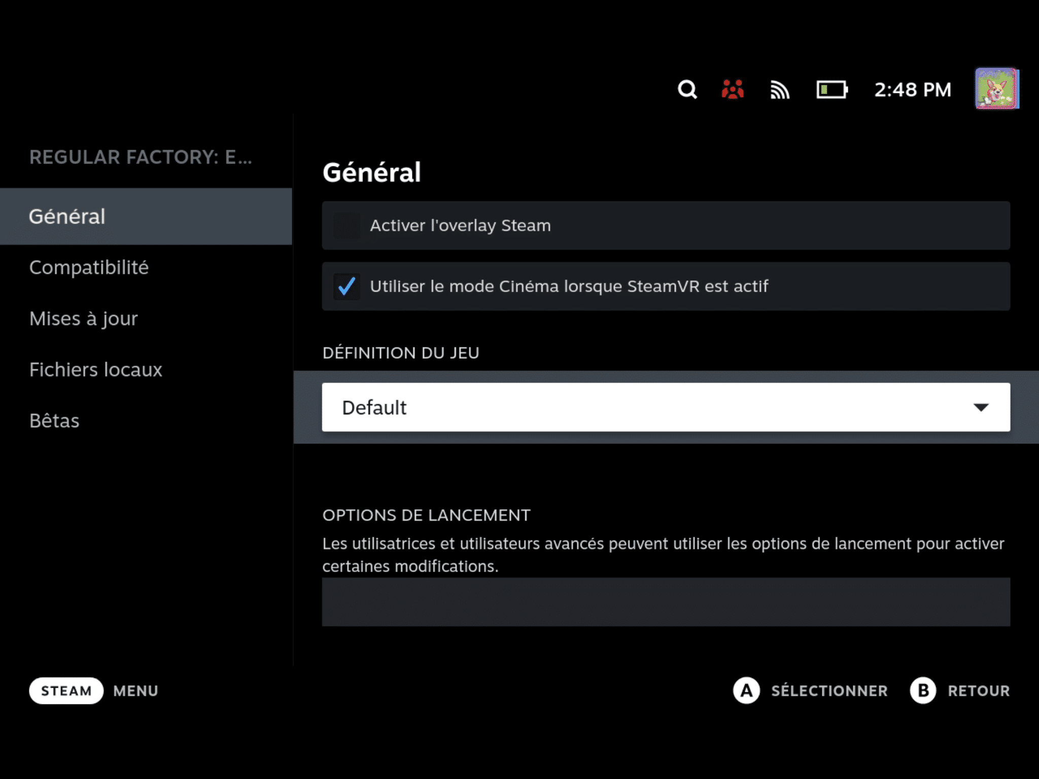 Si la définition sur l’écran est mauvaise, par exemple vous avez un écran 4:3 et le jeu est en 16:9. Dirigez-vous dans votre bibliothèque de jeu, sur la fiche du jeu puis choisissez l’engrenage. Dans le menu « Général » > « Définition du jeu » vous pouvez effectuer des réglages pour optimiser le rendu sur l’ensemble de votre écran en choisissant la définition de votre support.