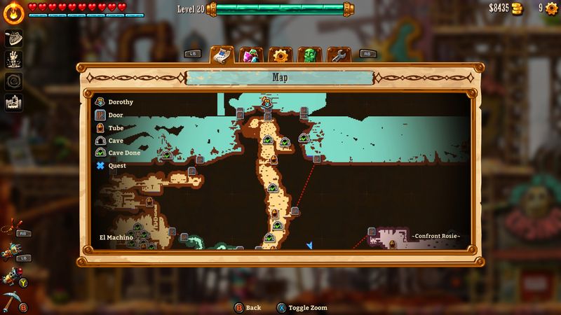 Contrairement au premier opus, les niveaux ne sont plus générés aléatoirement (génération procédurale). De plus ce SteamWorld Dig 2 s’offre un travail de level design plus soigné et même si l’expérience s’avère vite répétitive, les environnements sont plus variés et quelques phases de plateforme ainsi que des énigmes sont plutôt bien construites sans jamais être trop complexes. Dans tous les cas l’exploration reste libre. SteamWorld Dig 2 s’approprie des mécaniques du RPG que l’on avait déjà dans l’ancien jeu, la possibilité d’améliorer ses items. Par exemple en améliorant le sac, Dorothy peut ramener plus d’artefacts à la surface, améliorer l’armure permet d’améliorer la barre de vie, la flamme du mineur, d’avoir de la lumière pendant plus de temps, etc.