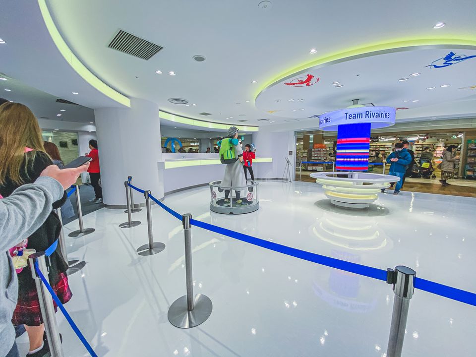 Du côté de l’espace jeu, vous pouvez vous rapprocher des animateurs pour participer à des combats entre dresseurs dans la Battle Zone, vous pouvez même demander à ajouter vos Pokémon dans une liste d’échanges et un animateur annoncera les Pokémon disponibles à l’échange. Une statue du Professeur Willow trône dans un espace qui servira prochainement à organiser des événements et au centre de cet espace, un écran permet de suivre l’arène du Pokémon Go Lab, à savoir quelle équipe l’occupe, quels Pokémon, etc.