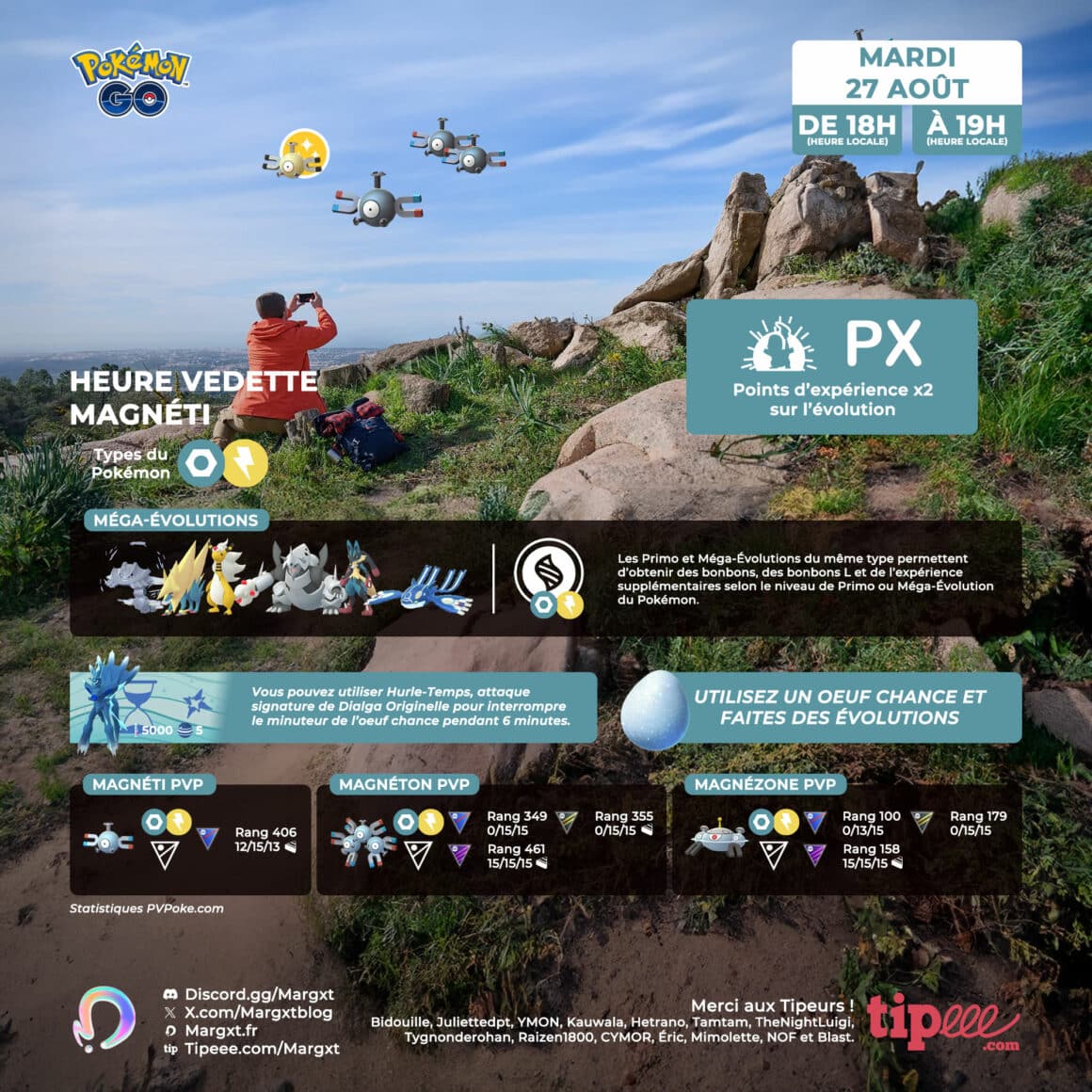 | 27 août 18h à 19h | ![]() Magnéti | ![]() XP x2 sur l’évolution | ![]() |