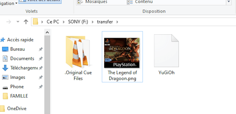 Si vous remarquerez que certains jeux n’ont pas de cover, c’est certainement que vous avez mal renommé le fichier image. Si c’est le cas, récupérez votre clé USB, branchez-la de nouveau à votre PC et dirigez-vous dans le dossier « transfer ». Les images qui n’ont pas été utilisées sont toujours là. Déplacez-les dans le dossier « Games » du jeu correspondant. Vous avez normalement un nouveau fichier image basique généré par le logiciel, récupérez son nom puis supprimez-le et renommez la bonne image de couverture avec le nom de l’autre fichier et acceptez. Exemple ci-dessous avec The Legend of Dragoon dans le dossier « Games » > 3.
